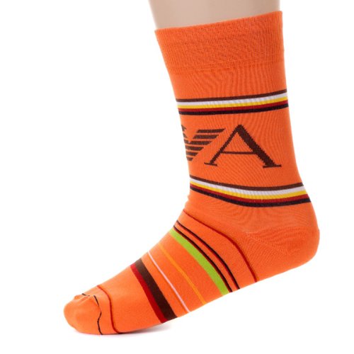 Emporio Armani orange socks EAM1630. Emporio Armani mens, orange striped cotton mix socks. Large EA signature logo, looped cotton/towelling lined inner foot. Comfort band for optimum hold. One size. Made in Italy. SKU-EAM1630